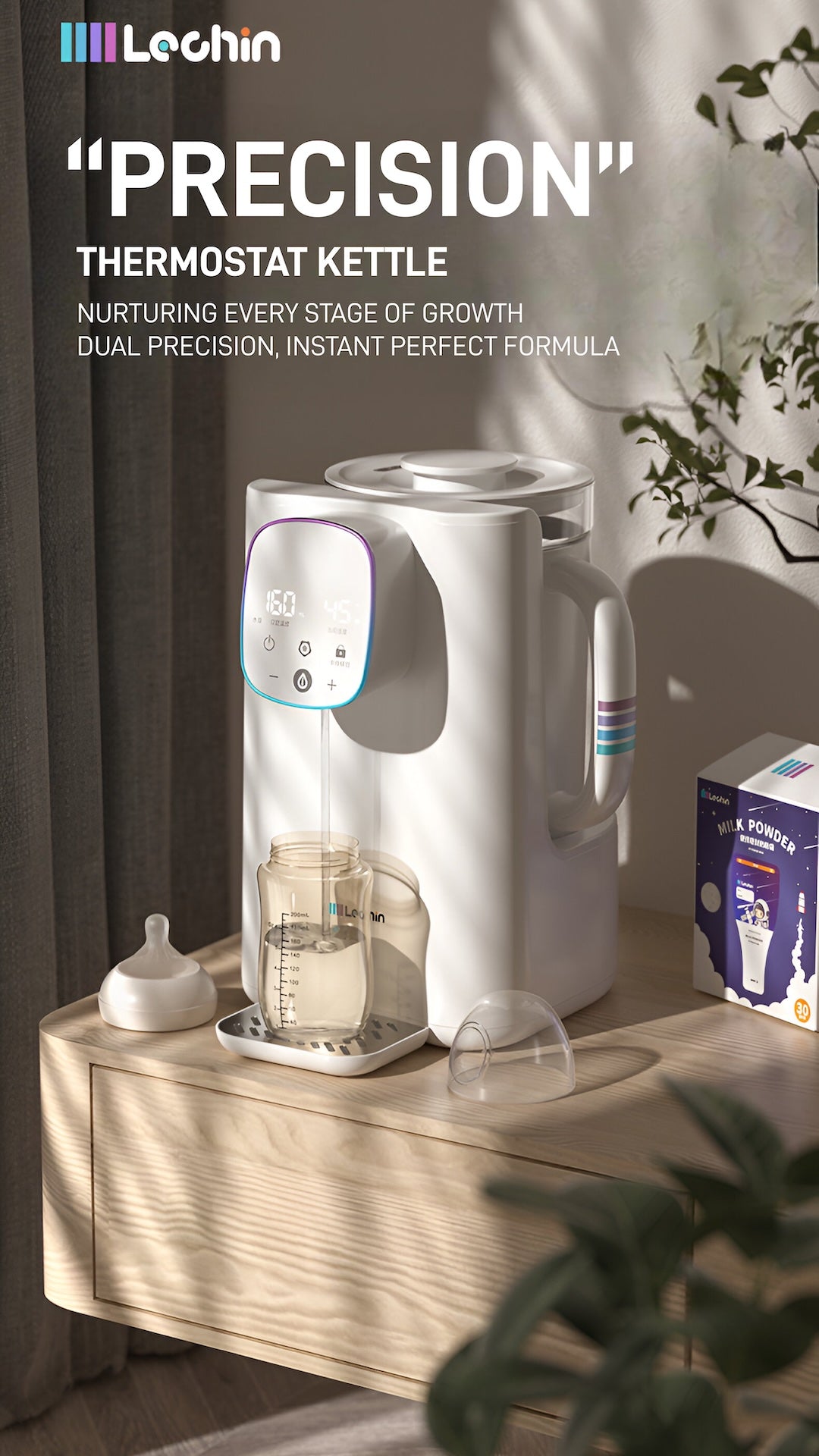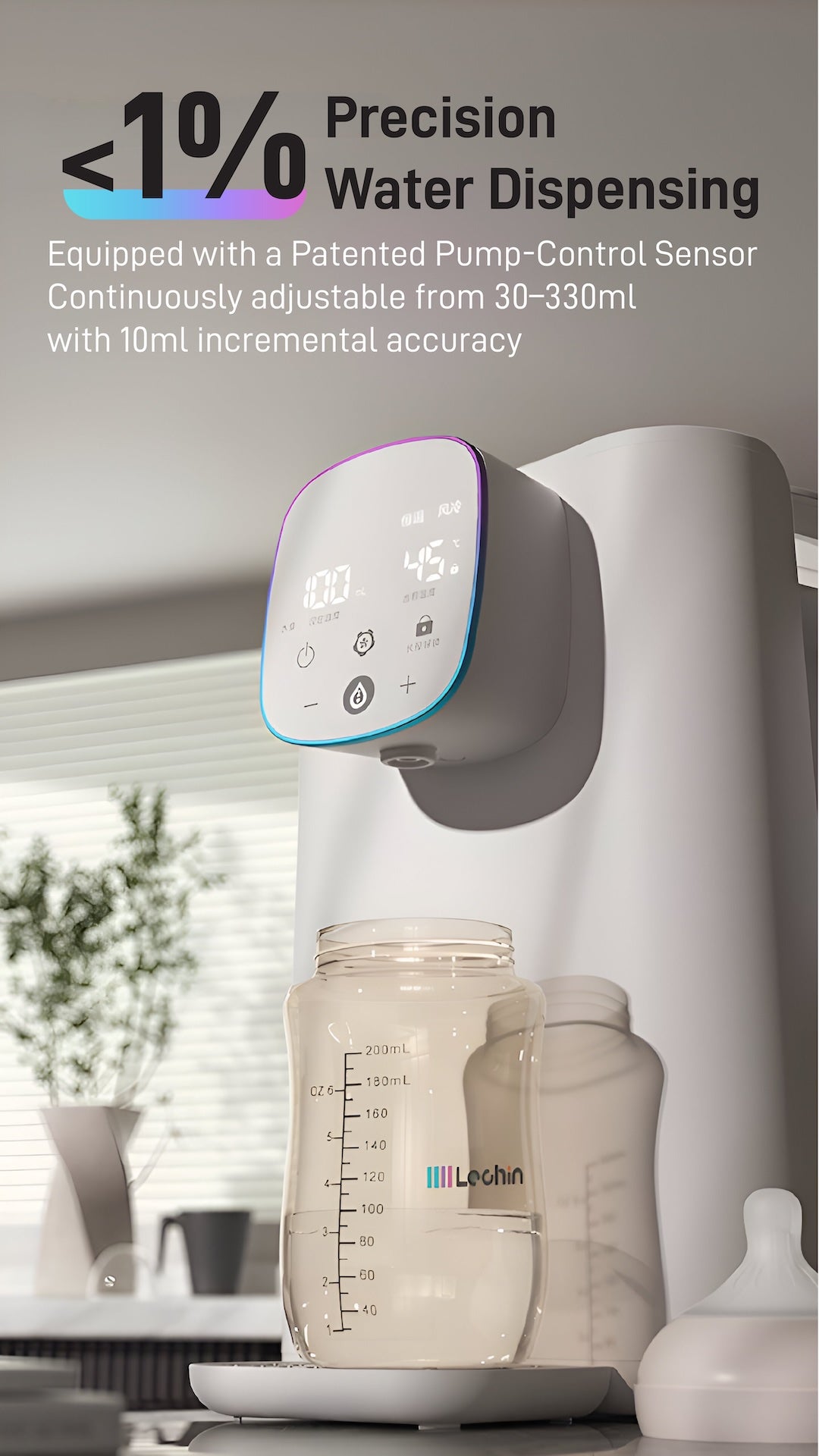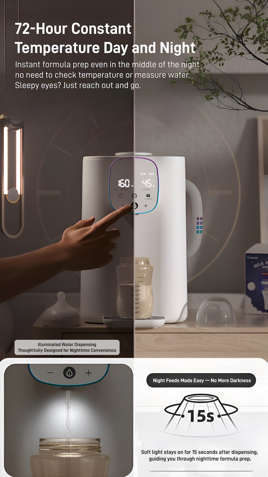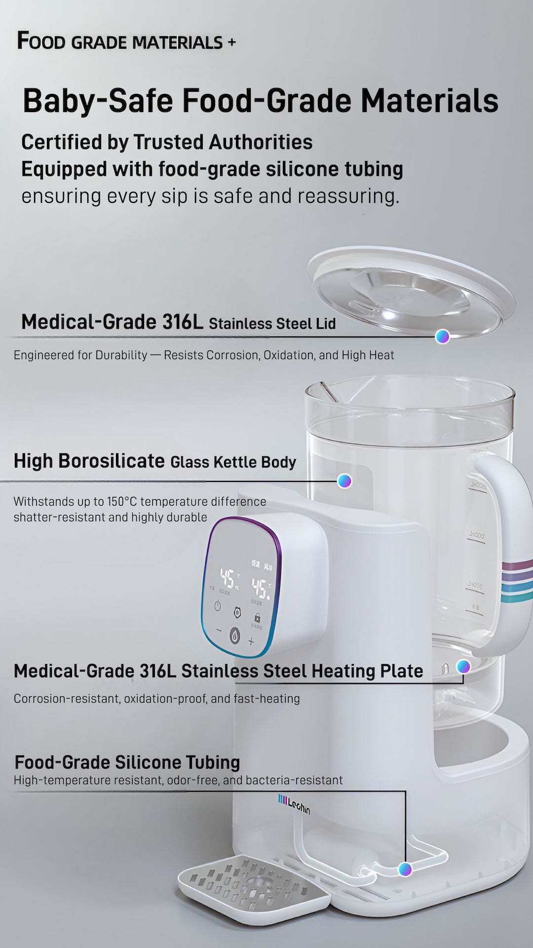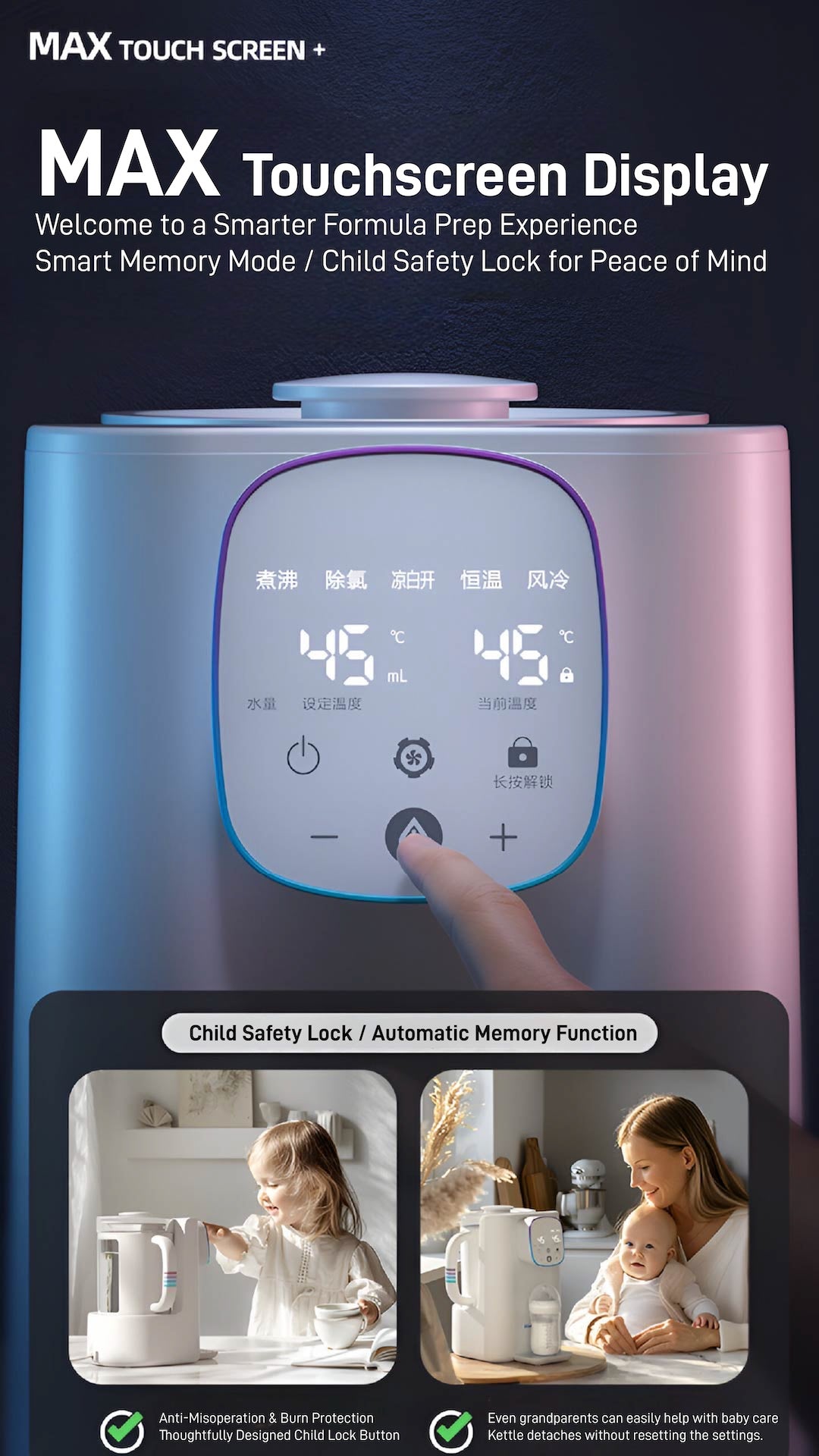Crafted with 316L stainless steel, high borosilicate glass, and food-safe materials, this intelligent kettle features precise dechlorination, a MAX touchscreen, child safety lock, and 72-hour constant temperature function — making night feeds faster, safer, and easier.