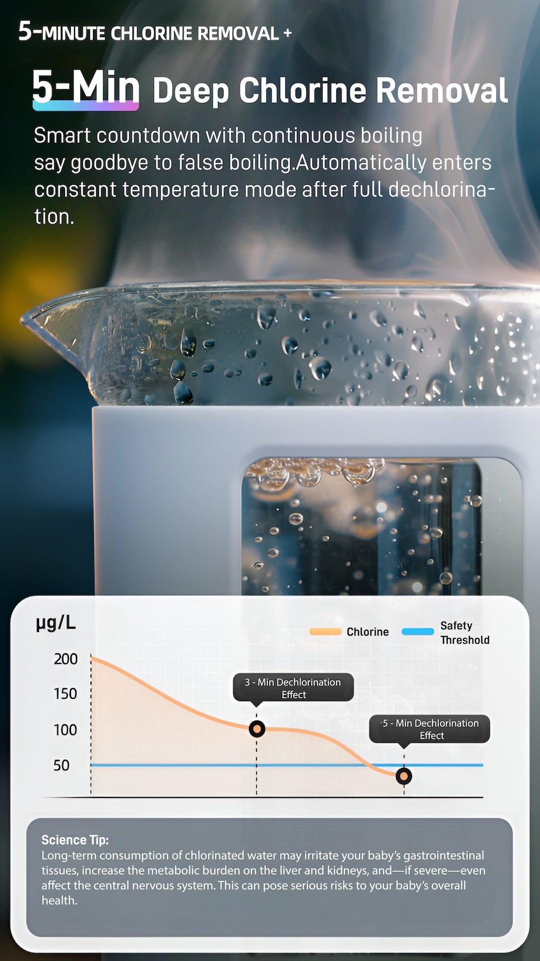 - 5-Min Deep Chlorine Removal – with smart countdown & real boiling
